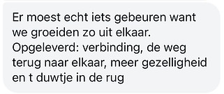 We vonden het ECHT een hele mooie aanvulling op de relatie die we al hebben. De vragen zijn mooi en nodigen uit om in gesprek te gaan met elkaar. De opdrachten waren laagdrempelig maar ook verdiepend en soms spannend. Jullie willen dat wij met elkaar in gesprek gaan, en niet dat jullie vertellen hoe het moet en die missie is wat ons betreft echt geslaagd! Jullie chemie en humor werkt ontnuchterend, ook bij ingewikkeldere onderwerpen. DANK DANK DANK!!